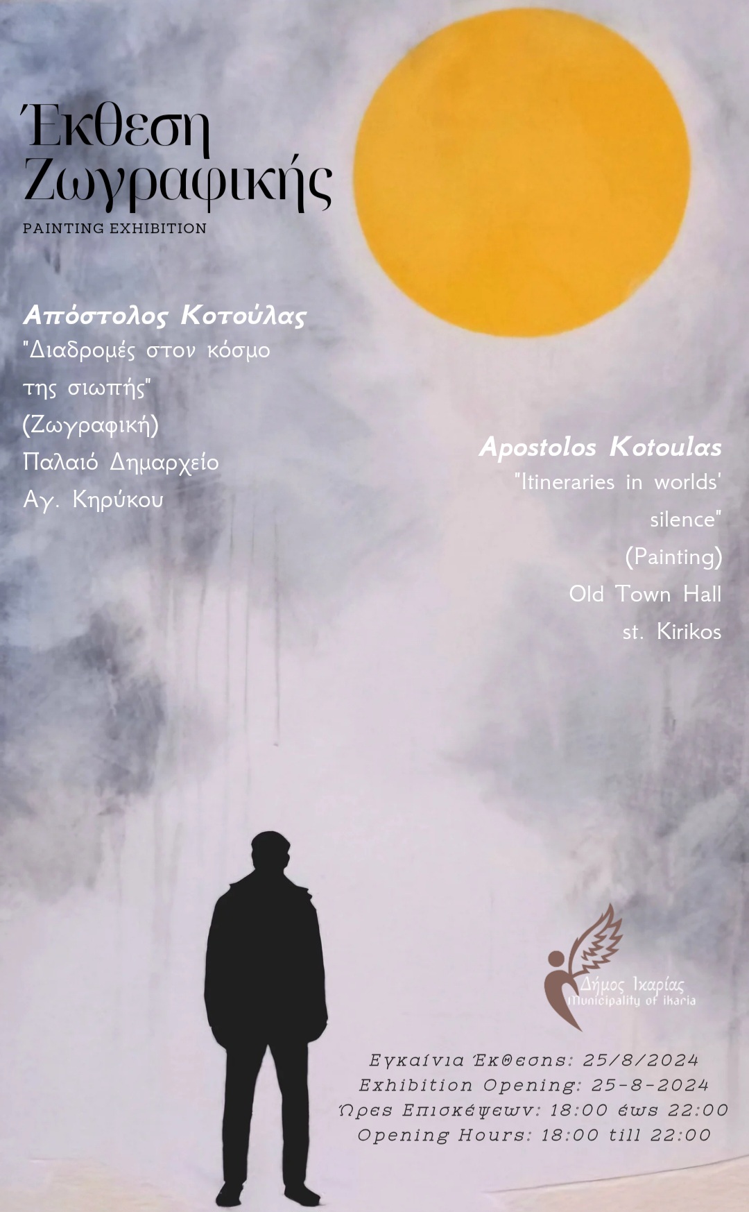 Ο Δήμος Ικαρίας, στα πλαίσια των δράσεων που προωθούν τον πολιτισμό, Φιλοξενει στην αίθουσα εκδηλωσεων του Παλιού Δημαρχείου, την έκθεση ζωγραφικής του εικαστικού Απόστολου Κοτούλα.