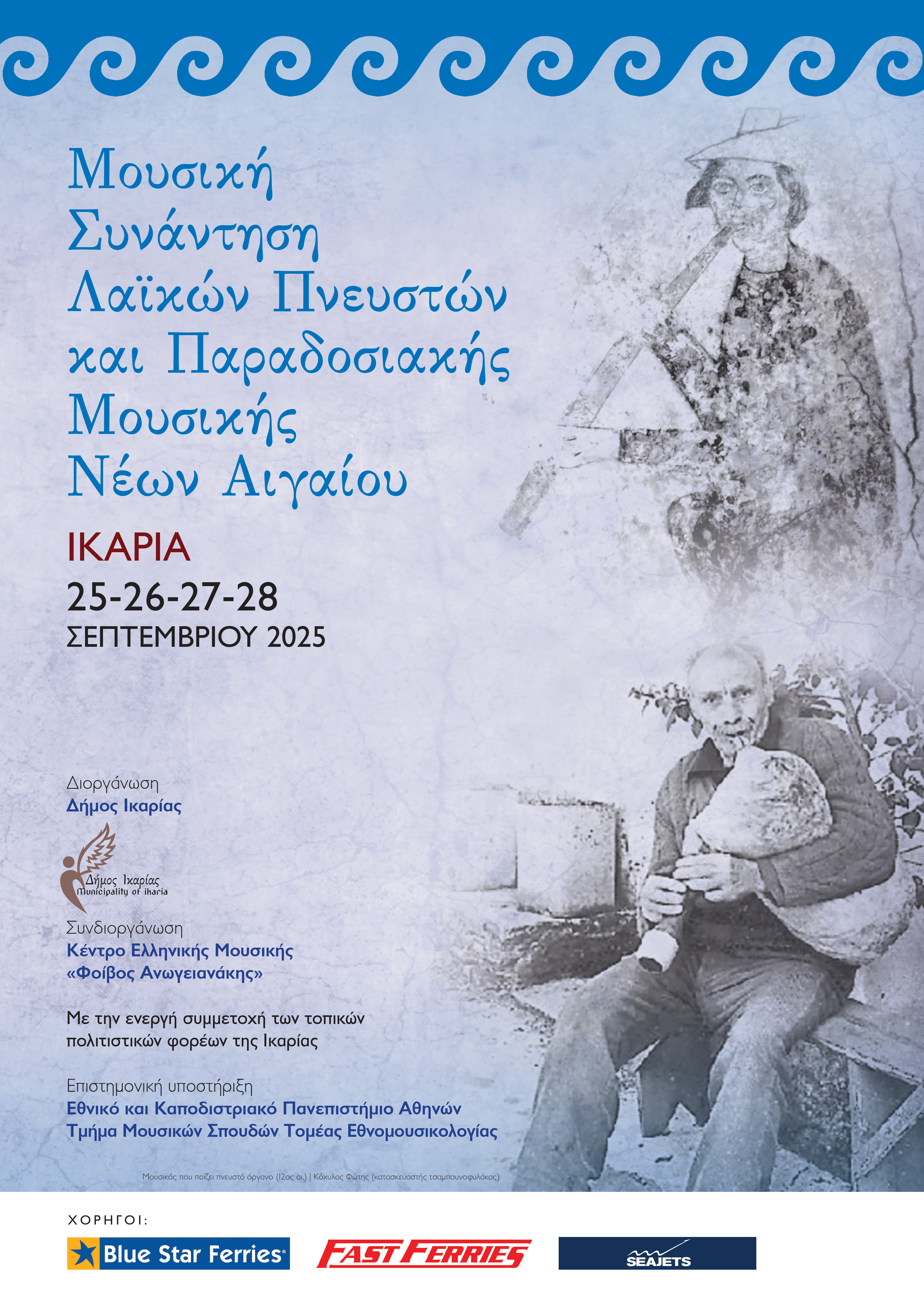 Από τις 26 έως τις 28 Σεπτεμβρίου, ο Δήμος Ικαρίας σε συνεργασία με το Κέντρο Ελληνικής Μουσικής «Φοίβος Ανωγειανάκης», και την υποστήριξη του Τμήματος Μουσικών Σπουδών του ΕΚΠΑ, διοργανώνουν την Μουσική συνάντηση Λαϊκών Πνευστών και Παραδοσιακής Μουσικής Νέων Αιγαίου.