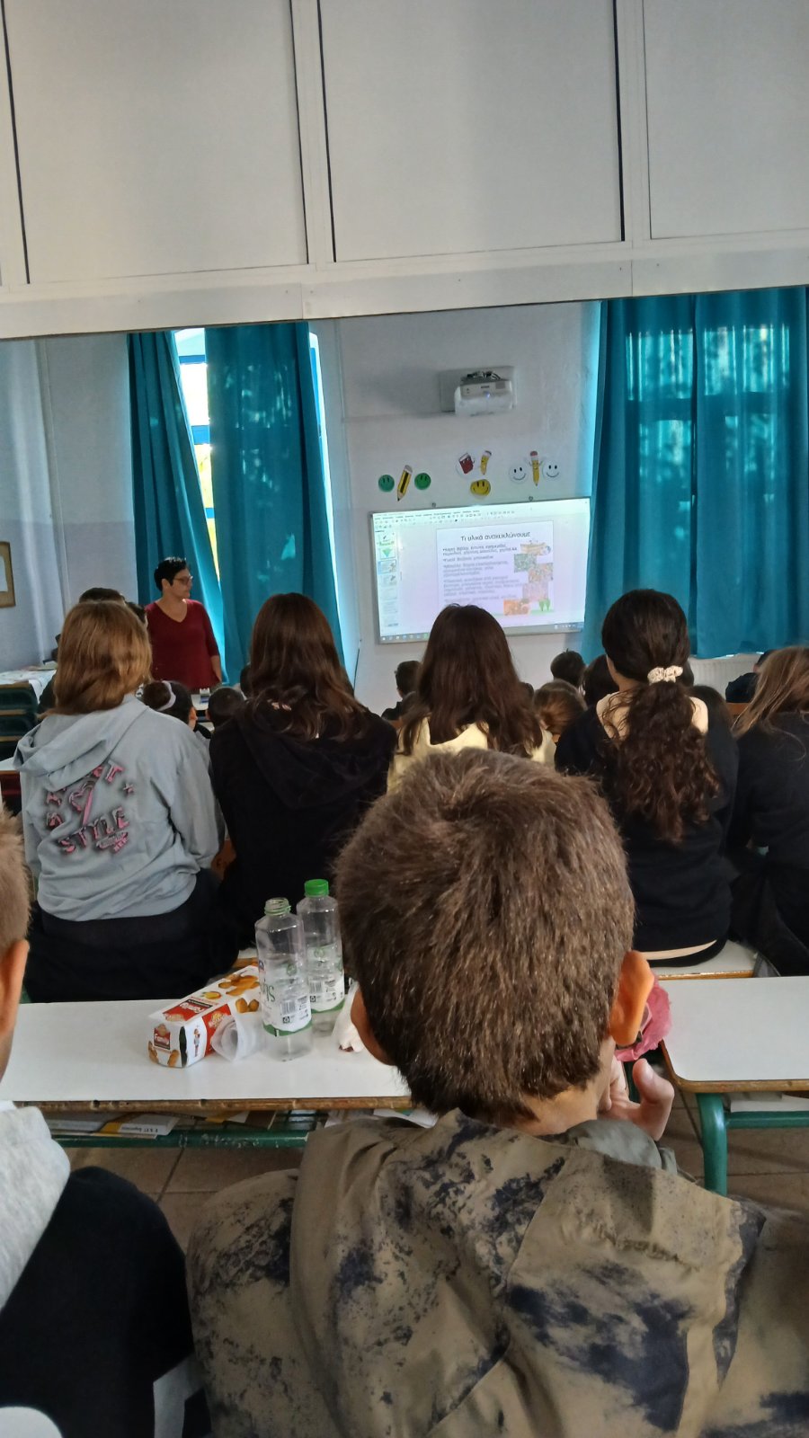 Στο σχολείο βρέθηκαν ο Δήμαρχος Καρούτσος Φανούρης και η Τεχνολόγος Περιβάλλοντος Μελεσανάκη Στεφανία, όπου μαζί με τους εκπαιδευτικούς, μίλησαν στα παιδιά για τις επιπτώσεις της ρύπανσης, για την διαχείριση των αποβλήτων και την ανακύκλωση γενικά, και ειδικά στο νησί μας.