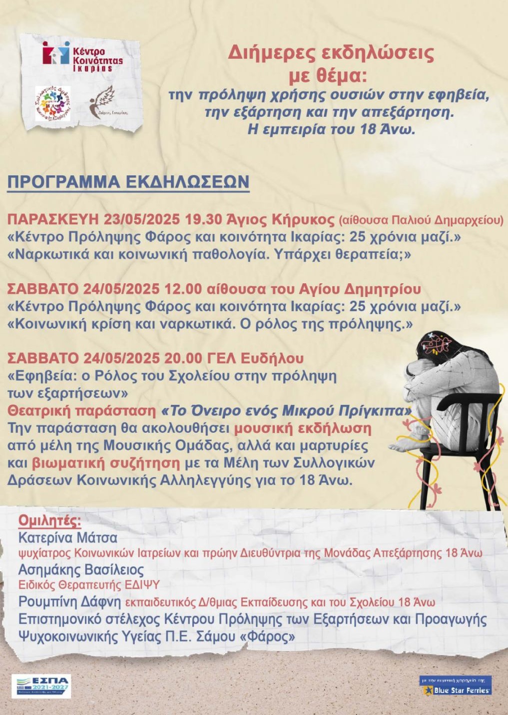 Η Δημοτική Αρχή Ικαρίας εκτιμώντας ότι η μάχη κατά των ναρκωτικών είναι μάχη ζωής, μάχη καθημερινή κατά όλων των εξαρτήσεων. Υποστηρίζει την πρωτοβουλία του Κέντρου Κοινότητας του Δήμου Ικαρίας και καλεί το σύνολο των φορέων του νησιού στις διήμερες εκδηλώσεις με θέμα «Πρόληψη χρήσης ουσιών στην εφηβεία, την εξάρτηση και την απεξάρτηση. Η εμπειρία του 18 Άνω» που διοργανώνουν σε συνεργασία με τις Συλλογικές Δράσεις Κοινωνικής Αλληλεγγύης για το 18 Άνω.