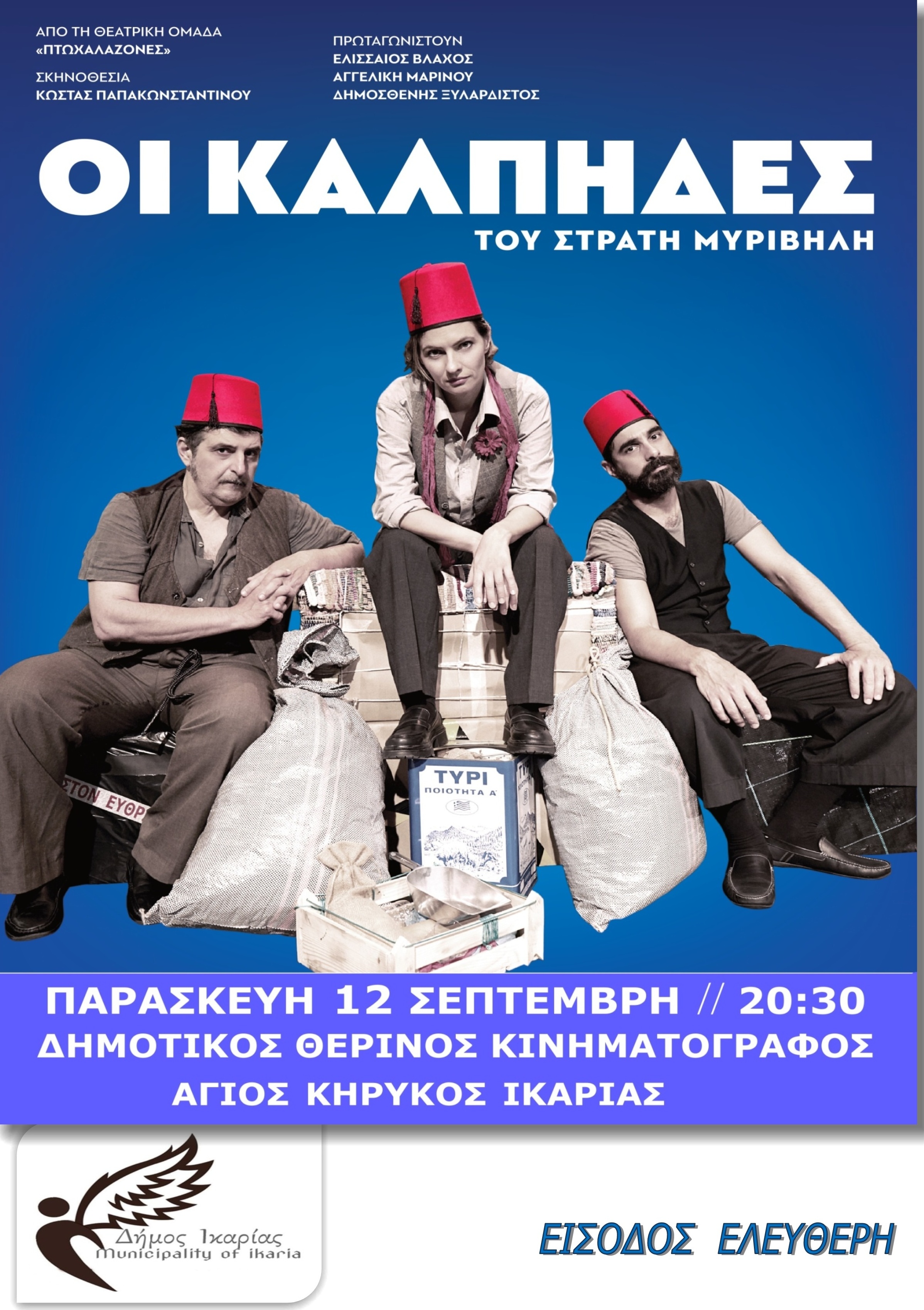 Ο Δήμος Ικαρίας Φιλοξενεί την θεατρική ομάδα «Πτωχαλαζόνες», και παρουσιάζουν την παράσταση «Οι κάλπηδες», μια θεατρική μεταφορά του κωμικού διηγήματος του Στρατή Μυριβήλη σε σκηνοθεσία Κώστα Παπακωνσταντίνου.