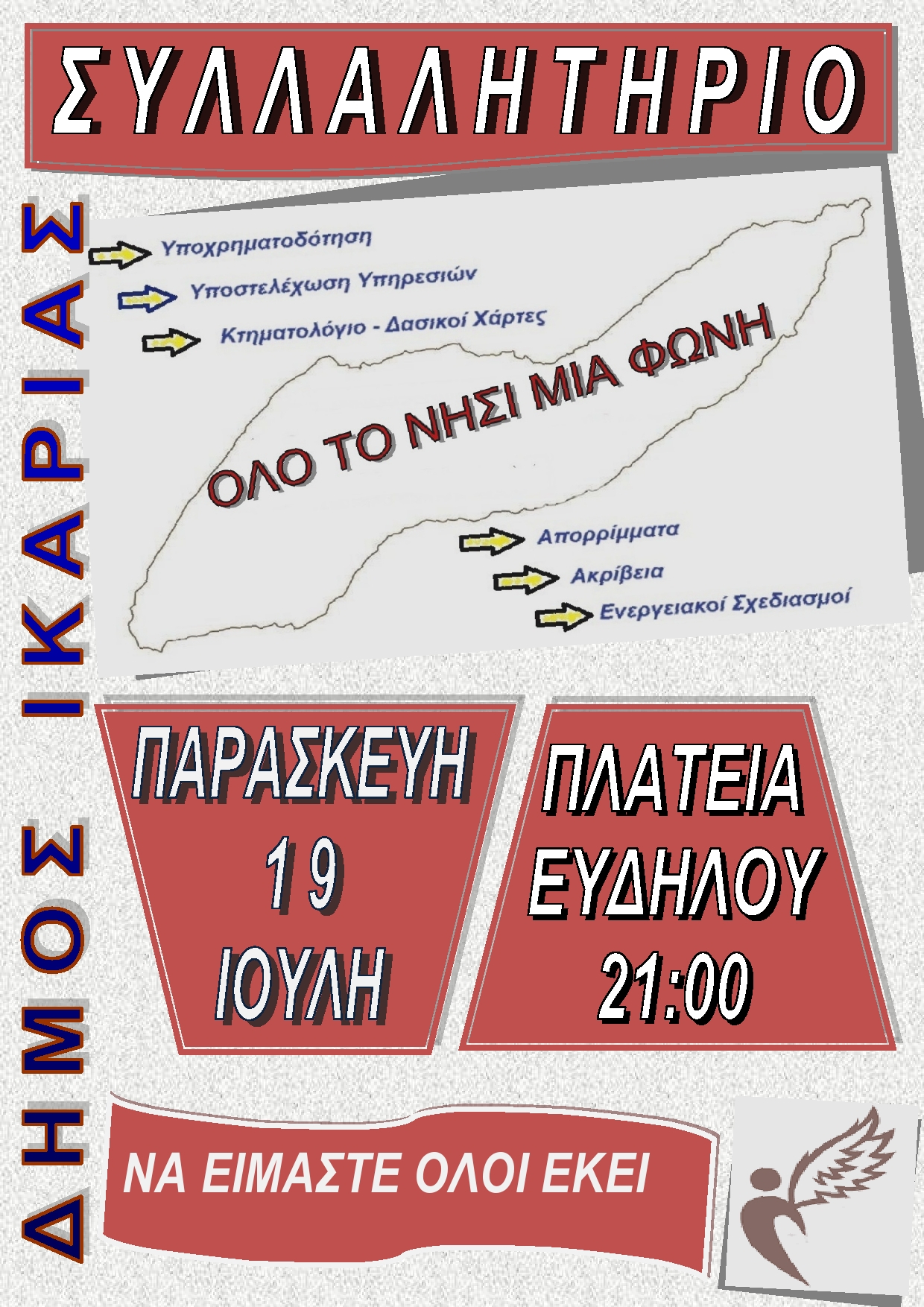 Απευθύνει κάλεσμα για συμμετοχή στην συγκέντρωση που οργανώνει ο Δήμος Ικαρίας την Παρασκευή 19 Ιούλη (9 μ.μ) στην πλατεία Ευδήλου.