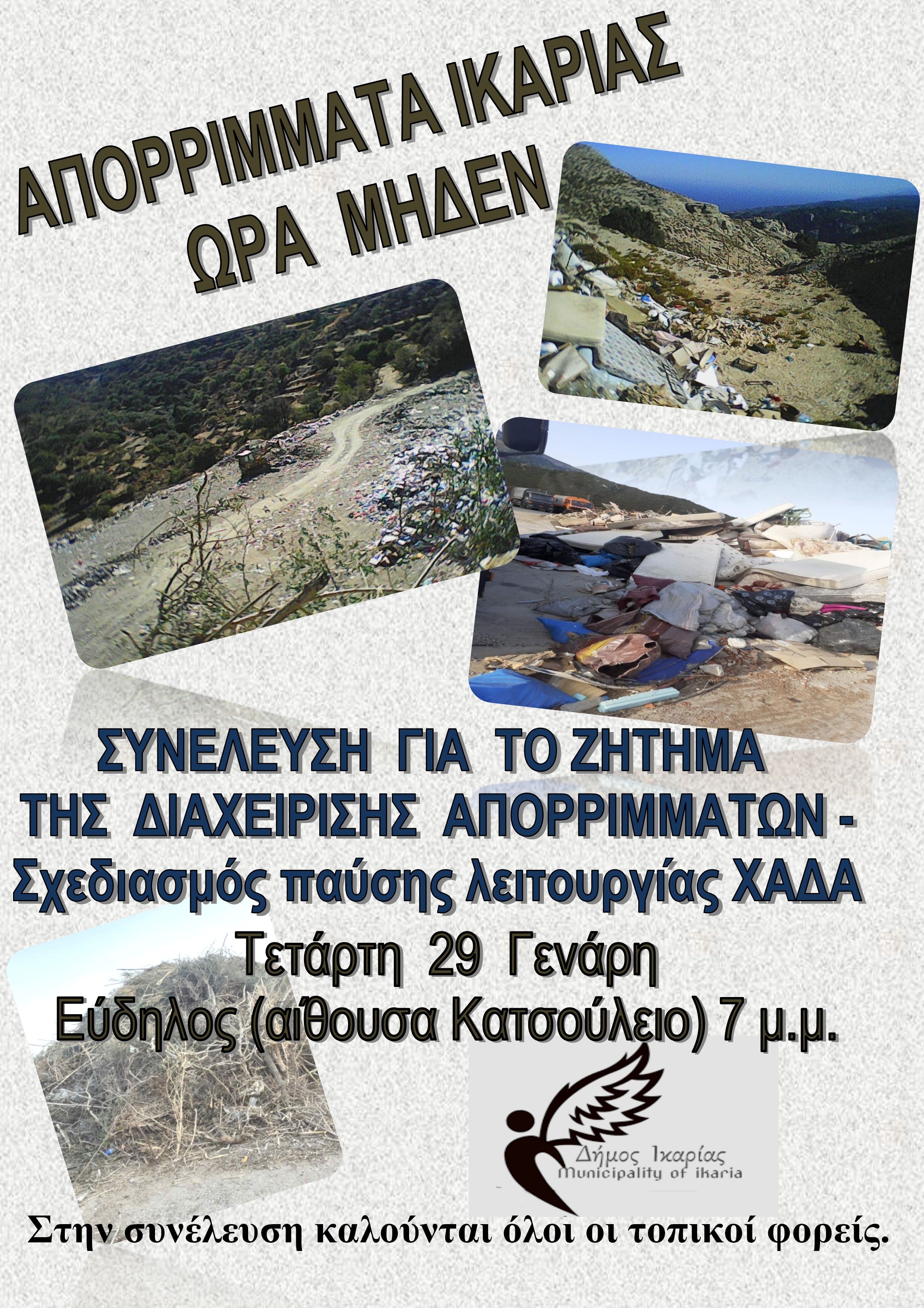 Ο Δήμαρχος Ικαρίας προσκαλεί την Τετάρτη 29/1/2025 στις 19:00 στην αίθουσα εκδηλώσεων του «Κατσουλιου» στον Εύδηλο, σε συνέλευση σχετικά με το ζήτημα της διαχείρισης απορριμμάτων και τον σχεδιασμό παύσης λειτουργίας των ΧΑΔΑ του νησιού.