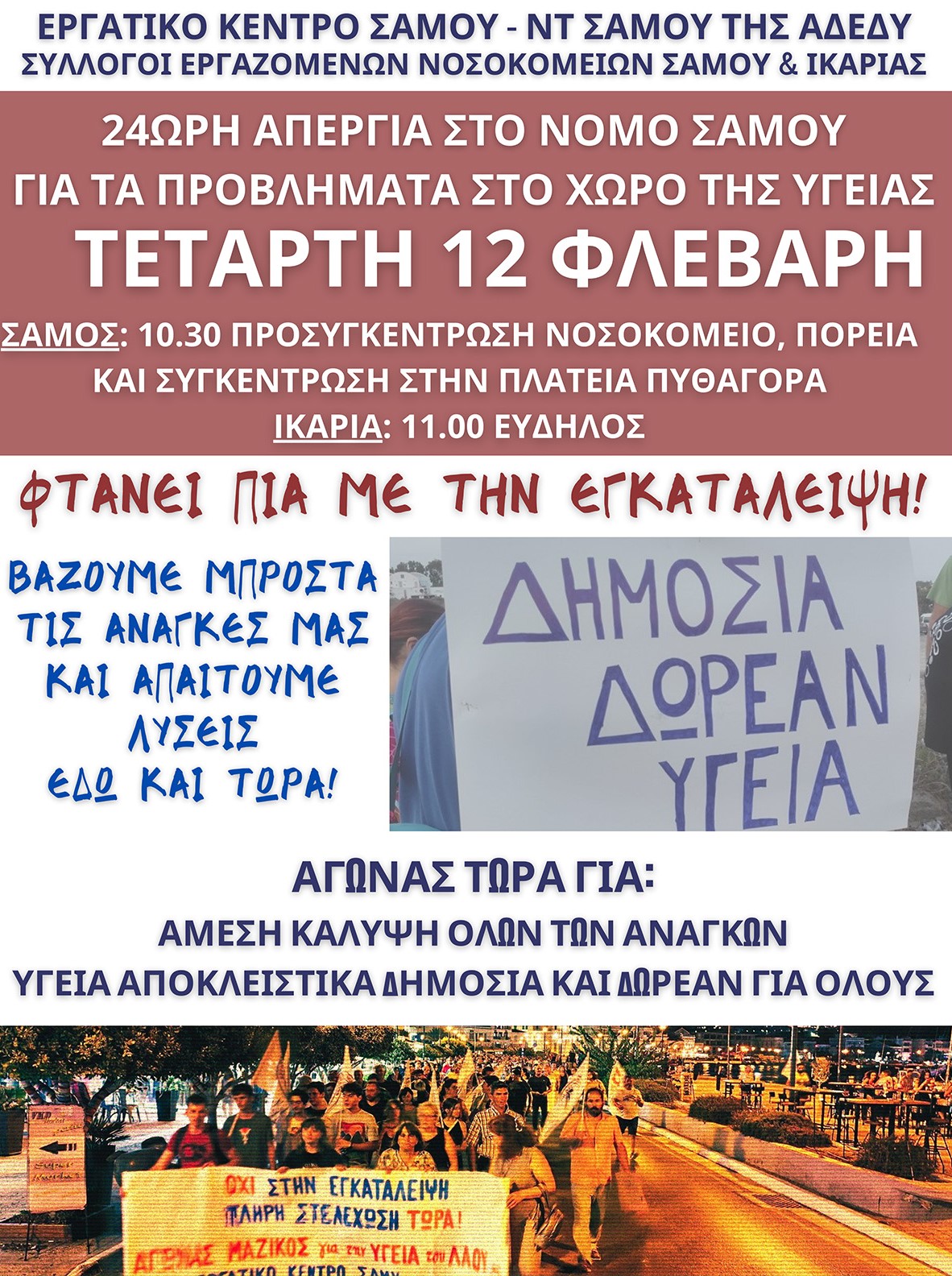 Το Δημοτικό Συμβούλιο Ικαρίας στην 1η /2025 συνεδρίαση του στις 28 Ιανουαρίου, αποφάσισε ομόφωνα - μετά από εισήγηση της Λαϊκής Συσπείρωσης- να στηρίξει την Πανσαμιακή απεργία για την Υγεία της Τετάρτης 12 Φεβρουαρίου 2025, με συγκέντρωση στην πλατεία του Ευδήλου στις 11 το πρωί.